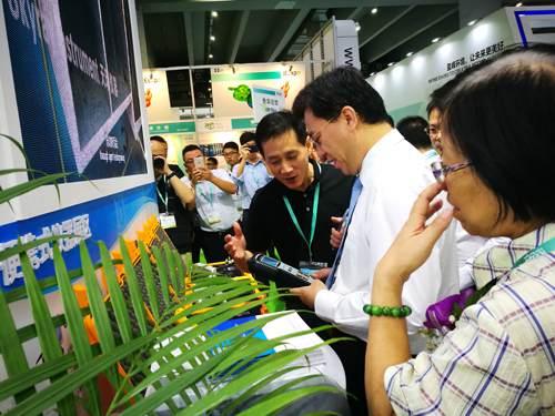 工作人員為廣東省環境監測協會呂小明會長介紹產品