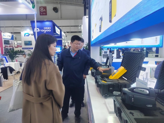 中國環境監測總站副站長毛玉如蒞(左三)臨天瑞儀器展臺參觀,天瑞儀器副總經理、磐合科儀董事長黎橋(右一)熱情接待