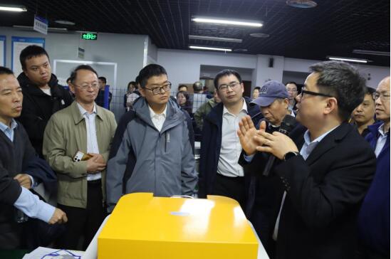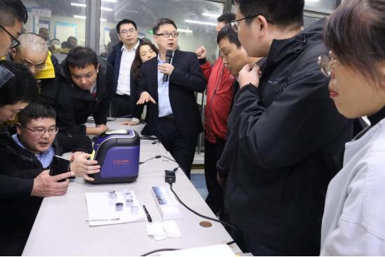 隨后,考察團一行移步至公司三樓Cube100S產品生產線。針對炭黑行業的關鍵檢測需求,天瑞技術專家在現場對Cube100S能量色散X熒光光譜儀、EDX3300SPLUS 側照式單波長X熒光光譜儀兩款儀器進行了專場講解與實機演示,儀器表現出的高精度與高穩定性,給專家領導們留下了深刻印象。他們不時駐足,就儀器的檢測原理、技術參數與天瑞工程師進行深入交流。