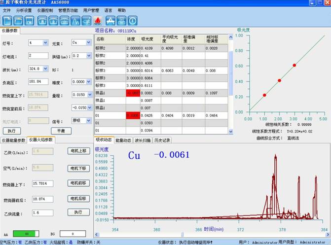 樣品測試:于原子吸收光譜儀波長324.8nm處,使用空氣-乙炔火焰,以水調(diào)零,測量試液的吸光度,減去隨同試料的空白試驗溶液的吸光度,從工作曲線上查出相應(yīng)的銅濃度。