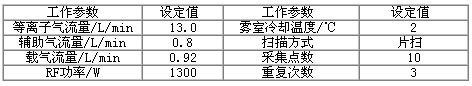 以10.0ng/mL Li 、Co 、In 、Ce 、U 和Bi混合調(diào)諧液優(yōu)化儀器工作參數(shù),使儀器靈敏度最佳,同時(shí)確保氧化物及雙電荷產(chǎn)率低于3%,具體工作參數(shù)見(jiàn)表1。在儀器最佳工作參數(shù)條件下,以內(nèi)標(biāo)法進(jìn)行測(cè)試。
