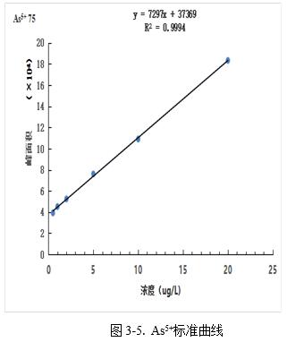 圖4為5.0μg/L混和標準溶液色譜圖,以各形態峰附近基線處的3倍信噪比(S/N)峰高對應的濃度作為檢出限,AsC、As3+、DMA、MMA、As5+分別為0.078μg/L、0.10μg/L、0.11μg/L、0.13μg/L、0.16μg/L。