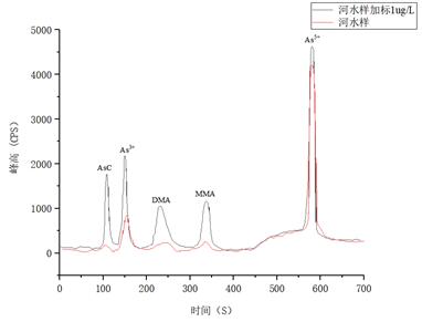河水樣品及加標1μg/L的測試結果詳見表4,樣品及加標后砷形態疊加譜圖如圖5所示。