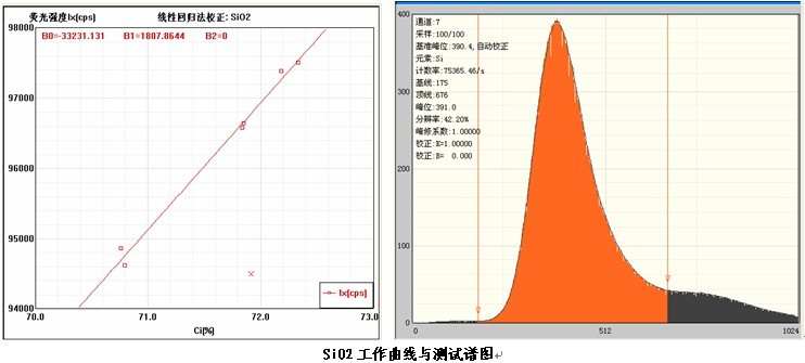 各個元素的工作曲線與測試譜圖,其中B0為曲線節(jié)距;B1:為曲線斜率;在測試譜圖中有元素的測試信息:計數(shù)率,采樣時間,分辨率等。